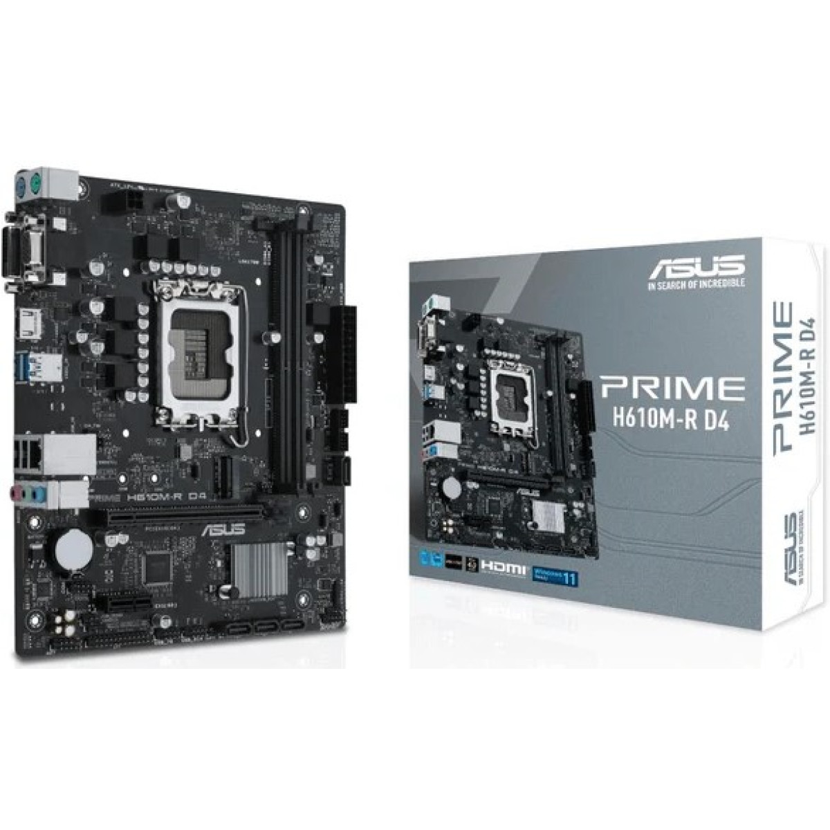 Asus Prime H610M-R D4 Intel LGA 1700 micro ATX Motherboard – Intel, Processor socket LGA 1700, Compatible processor series Intel® Celeron®, Intel® Core™ i3, Intel® Core™ i5, Intel® Core™ i7, Intel® Core™ i9, Intel Pentium G. Supported memory types DDR4-SDRAM, Maximum internal memory 64GB, Memory slots type DIMM. Supported storage drive interfaces M.2, SATA III, Supported storage drive types HDD & SSD. Maximum resolution 3840 x 2160 pixels. USB connector type USB Type-A.