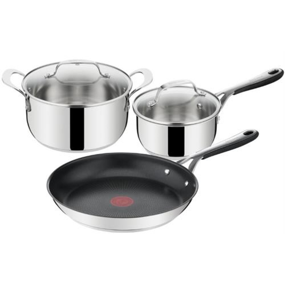 Jamie Oliver Kitchen Essential Stainless Steel 5 Piece Cookware Set- By Tefal, Designed by Jamie Oliver, Features Thermo-Signal Spot Technology, Riveted Stainless Steel Handles, Includes 1x 28cm Non-Stick Frying Pan, 1 x 1.5 Litre Saucepan 1 x 3 Litre Stewpot, 2x Clear Glass Vented Lids, Compatible With All Hobs Excluding Induction, Retail Box Out of Box Failure