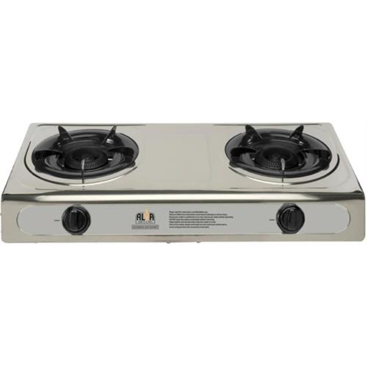 Alva Stainless Steel Two Plate Gas Stove- Large Construction Double Burner Stainless Steel Stove, Piezo Ignition, Angled Flame Allows For Wide Heat Spread, Low Gas Consumption, Stainless Steel Surface, Vitreous Enamel Pot Holders, Hose And Regulator Not Included, Retail Box 1 Year Warranty