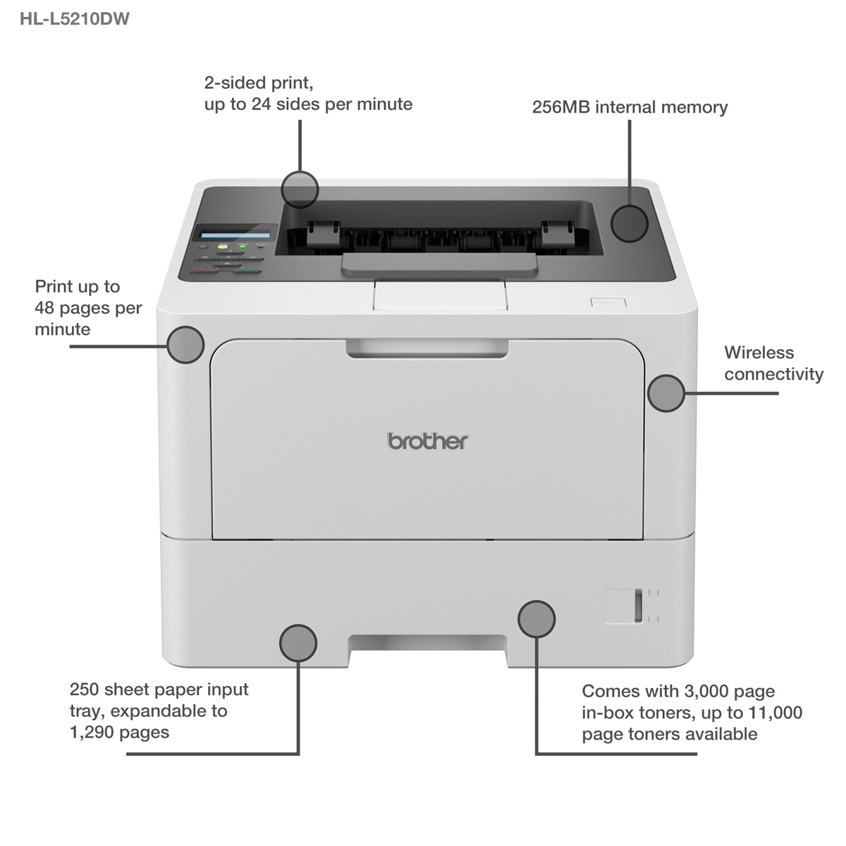 Built for business, The HL-L5210DW mono laser printer is designed to deliver professional performance with high-speed, high-quality printing you can depend on. The HL-L5210DW also gives you a choice of connectivity options and the added flexibility of tailoring the paper input to suit the print needs of your business. The HL-L5210DW comes with a flexible suite of security features and solutions that can be tailored to your business, enabling you to easily audit, control and manage your fleet of devices securely.