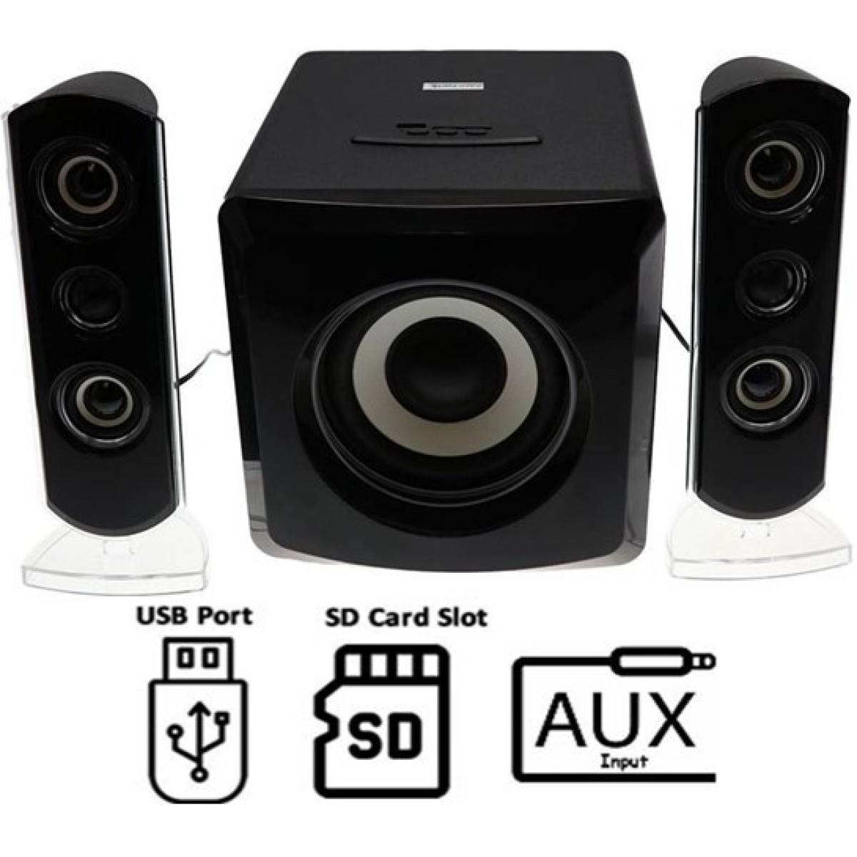 AudioMate 2 Channel and Subwoofer Stereo Speaker System- Power Output 30 Watts RMS (1x 16 Watts RMS Subwoofer and 2x 7 Watts RMS Satellite Speakers), Blue LED lighting , Audio Input 3.5mm Jack , Volume And Bass Control On Subwoofer, USB And SD Card Slots On Subwoofer, S/N Ration 65dB , Power 230v/50Hz, Compatible With Desktop PC’s , Laptops And Televisions Using 3.5mm AUX Cable And Jack , Retail Box , 6 Months Warranty